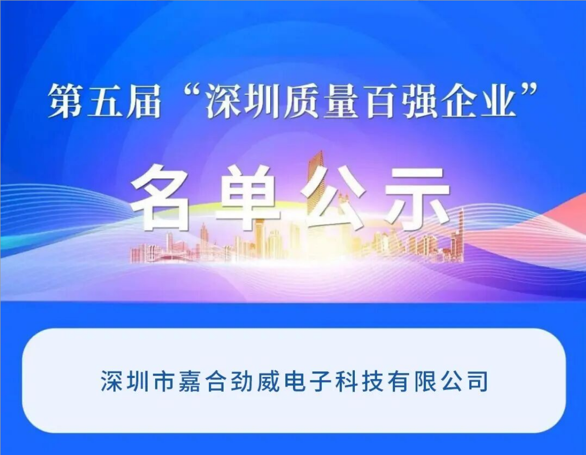 1月21日,第五届“深圳质量百强企业”榜单正式发布,嘉合劲威凭借在企业质量管理体系、经济效益、市场表现、荣誉奖项及社会责任等多维度的突出表现,成功入选“深圳质量百强企业”,彰显了我司在质量建设与综合实力方面的卓越成就。